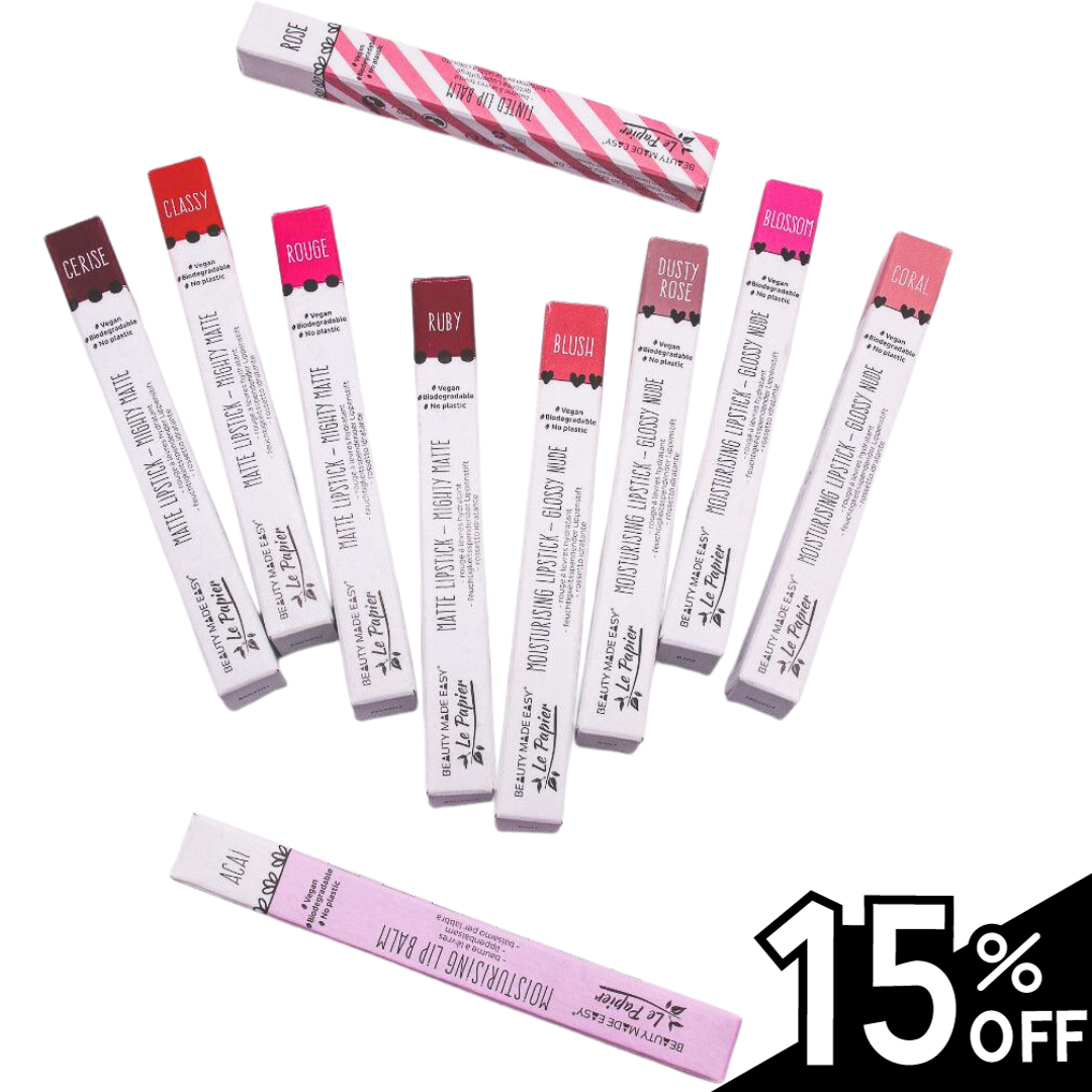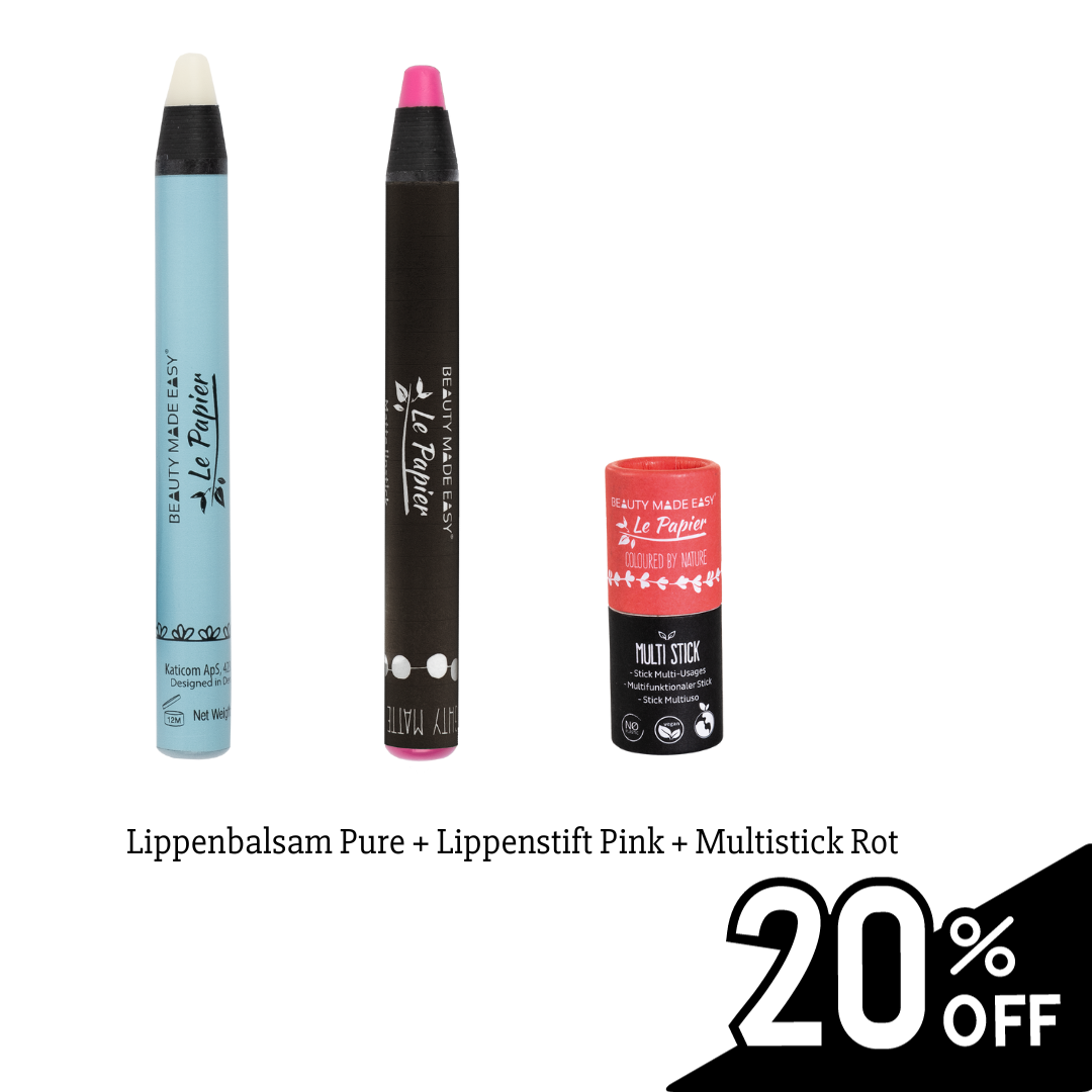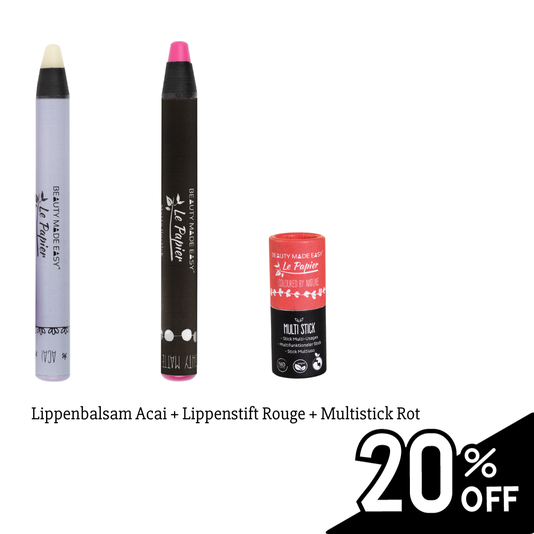 Endlich ein Lippenbalsam, das natürlich wirkt und pflegt – und ganz ohne Plastikverpackung auskommt. Das neue Le Papier Lippenbalsam setzt auf hochwertige Inhaltsstoffe und natürliche Anmutung. Für die wunderbare Pflege deiner Lippen sorgen wertvolles Jojobaöl, Mandelöl, Vitamin E und Shea Butter. Mehr braucht natürliche Schönheit heutzutage nicht, schon gar keine Mineralöle oder anderweitige künstliche Ingredienzien. Die Verpackung besteht ausschließlich aus recyclingfähigem Papier. Die Anwendung ist einfach, die Wirkung natürlich intensiv.